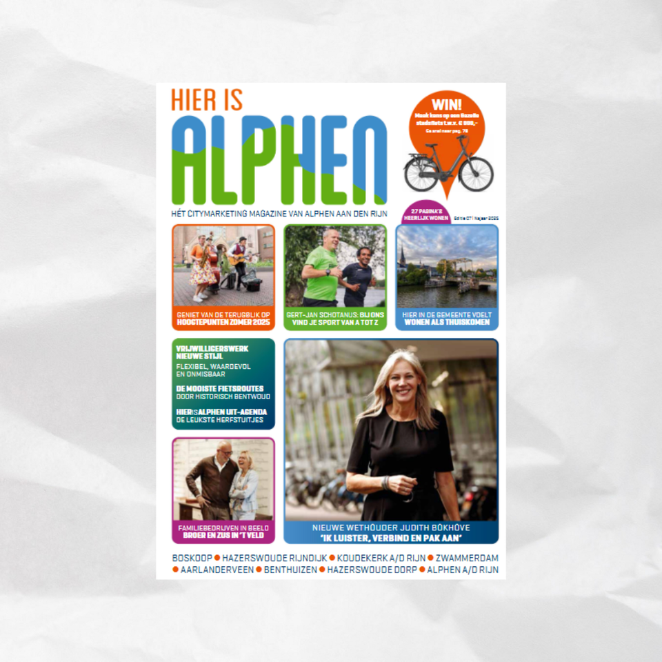 Heb je het magazine niet ontvangen? Lees dan nu de online versie. Heb jij ook interesse om in het volgende nummer te adverteren, of heb jij een mooi verhaal te vertellen of andere leuke tips? Neem dan contact op via redactie@hierisalphen.nl met onze redactie.