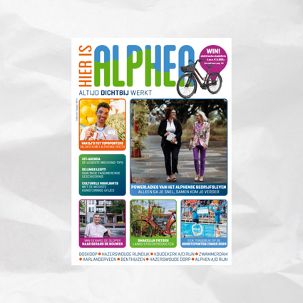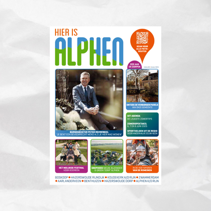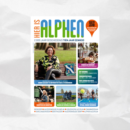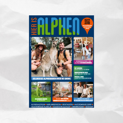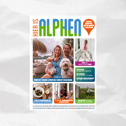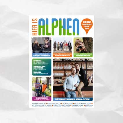 Dit papieren magazine met een omvang van inmiddels 100 pagina’s dik, geeft je onder andere een kijkje in de uitgebreide UIT-agenda, evenementenkalender en alle culturele activiteiten in de theaters en op festivals. We laten ondernemers hun bijzondere verhaal vertellen, laten vrijwilligers aan het woord en laten we zien wat zo typisch Alphen is. Kortom een magazine voor jong en oud, voor alle ondernemers, inwoners en bezoekers van onze gemeente.