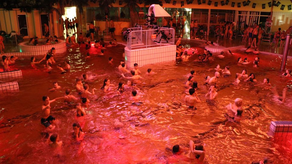 • Een spookachtig aangekleed zwembad met bloedrood water.