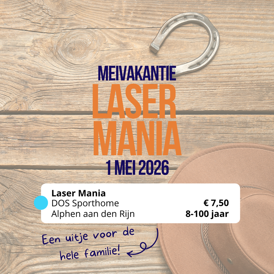 Op vrijdag 1 mei is het tijd voor actie en avontuur tijdens Lasermania, de cowboy editie! Stap in de zaal en ga de strijd aan tijdens 2 spannende rondes van 20 minuten lasergamen, met tussendoor een korte pauze om weer op adem te komen.