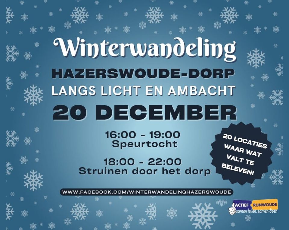 Actief Rijnwoude, het Dorpsoverleg en een aantal ondernemers organiseren op 20 december gezamenlijk een Winterwandeling door Hazerswoude-Dorp. Deelname is gratis.