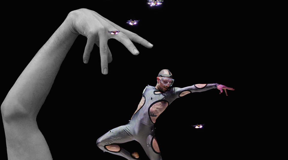 Virtuele handen bewegen mee via motion capture, terwijl in het werk Arms drones samen een bovenlijf vormen dat reageert op improviserende dansers. Zo ontstaat een directe dialoog tussen mens en machine, waarin technologie niet alleen ondersteunt, maar zelf lijkt mee te voelen. En in Flyland (2016) lijken da…