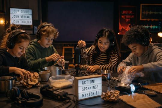 Wat hoor je als je niets ziet? In deze workshop ontdekken kinderen hoe je met geluid alleen een echte thriller maakt. Met alledaagse voorwerpen creëren ze spannende geluiden: voetstappen, krakende deuren, geheimzinnige wind… net als in films, podcasts en luisterboeken.