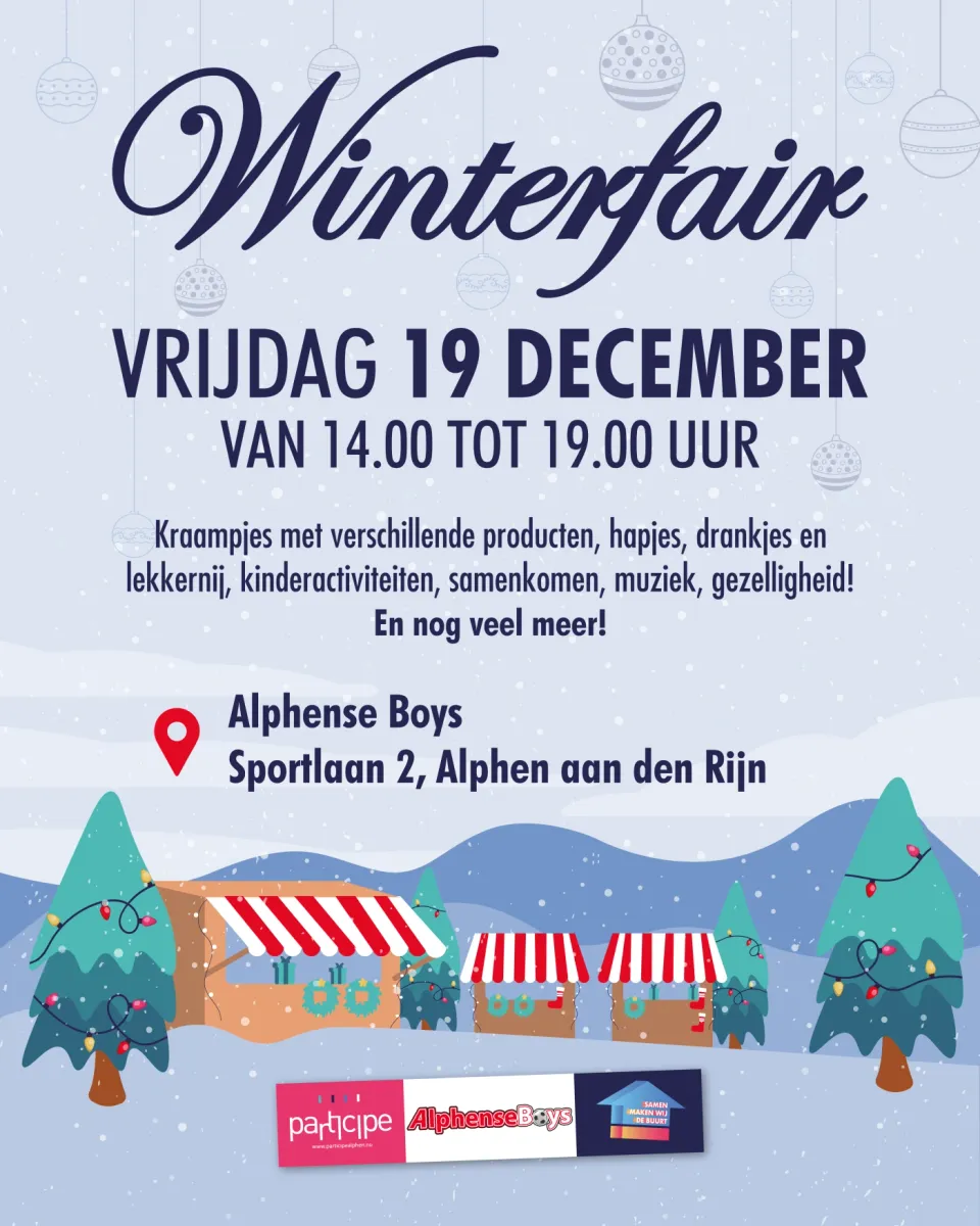 Op vrijdag 19 december organiseert Participe een feestelijke winterfair in kerstsfeer van 14.00 tot 19.00 uur bij Alphense Boys, Sportlaan 2 in Alphen aan den Rijn.