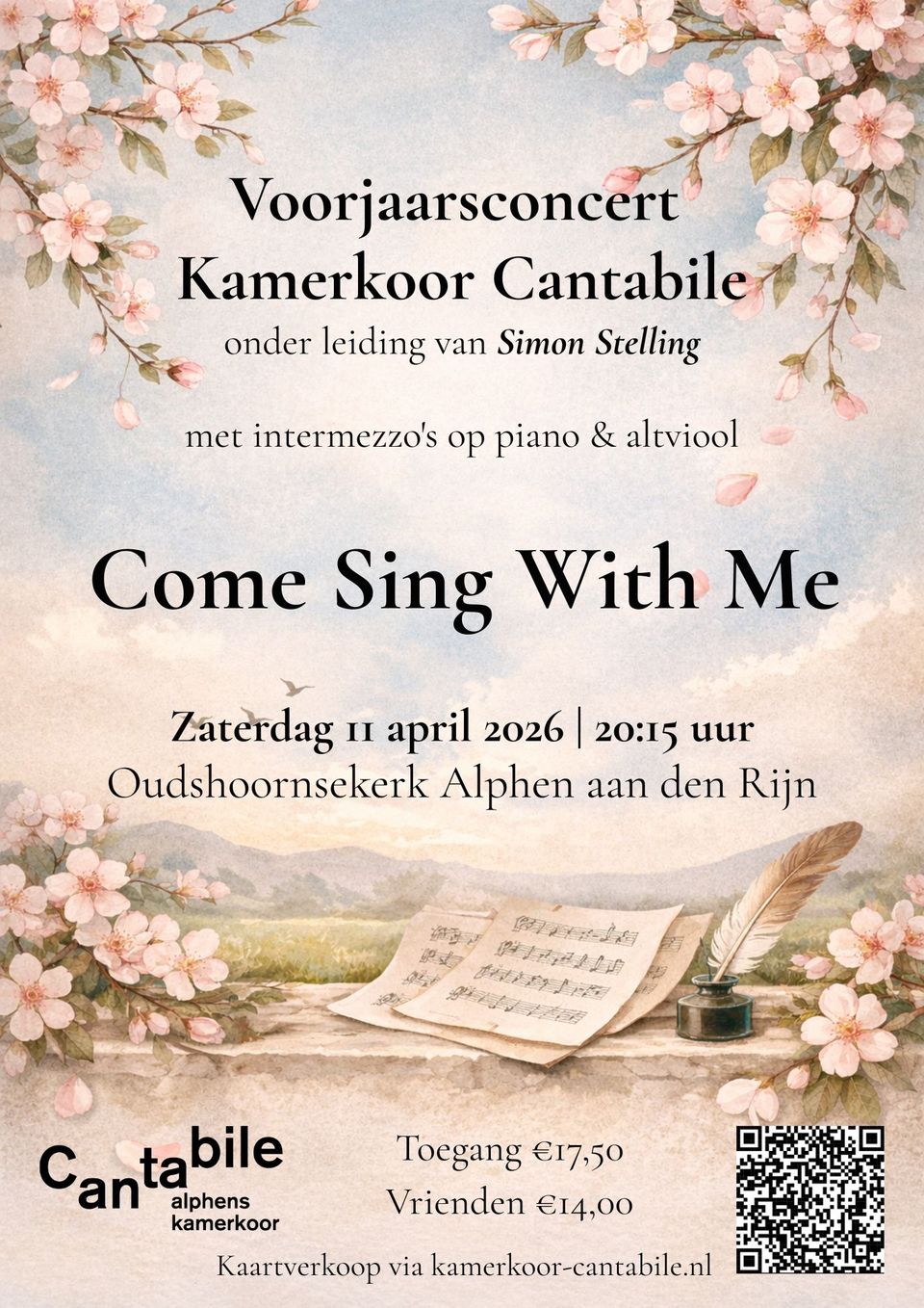 Alphens Kamerkoor Cantabile geeft onder leiding van Simon Stelling op zaterdag 11 april 2026 een sprankelend voorjaarsconcert met als thema ‘Come Sing With Me'. Op het concertprogramma staan natuur- en liefdesliederen, met o.a. ‘Des Abends kann ich nicht schlafen gehn’ van de Duitse componist Johannes Brahms en ‘Les fleurs et les arbres’ van de Franse componist Camille Saint-Saëns. Daarnaast brengen zij ook een aantal Engelse partsongs ten gehore, zoals ‘The long day closes’ van componist Arthur Sullivan, en het prachtige ‘Northern Lights’ van de hedendaagse Noorse componist Ola Gjeilo. Ook bevat het programma enkele intermezzo’s met Simon Stelling op piano en Hagit Amirav op altviool.